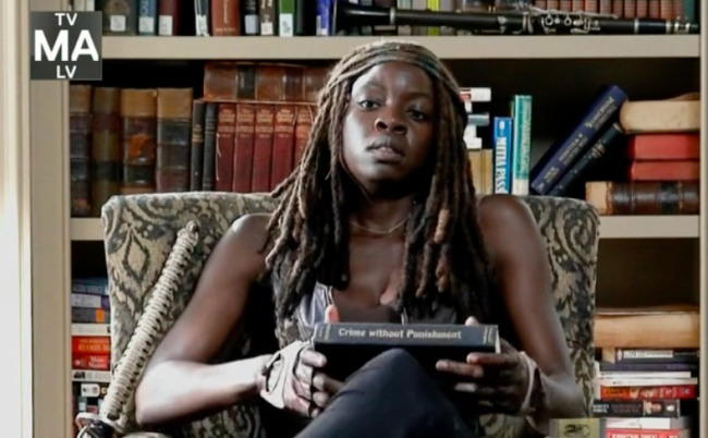Si el capítulo no es ya demasiada paranoia, Tyrese empieza a alucinar. Escucha voces de la radio de la habitación, ve al hombre que casi mató en la cabaña (cuando intentó atacar a Judith), a Bob, al Gobernador (!!!!), a las niñas locas que cuidó durante algún capítulo de la 4a temporada y a Beth. Todos están heridos. Bob y las niñas le intentan tranquilizar al decirle que “ahora ya está todo bien” y el Gobernador y el otro chico le dicen de todo para cabrearlo. Vuelve a aparecer otro zombie y no consigue defenderse, así que deja que lo muerda en el mismo brazo mientras coge una piedra para matarlo. Imagínate la sangre que habrá perdido ya.